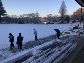 生徒が登校し、校舎周辺の雪を取り除いています。