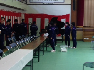 生徒たちは、着任式、始業式を行った後、入学式の会場を設営します。