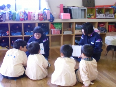 オリジナルキャラクタに興味をもつ園児たち 理解してもらえるように読み方も工夫しました