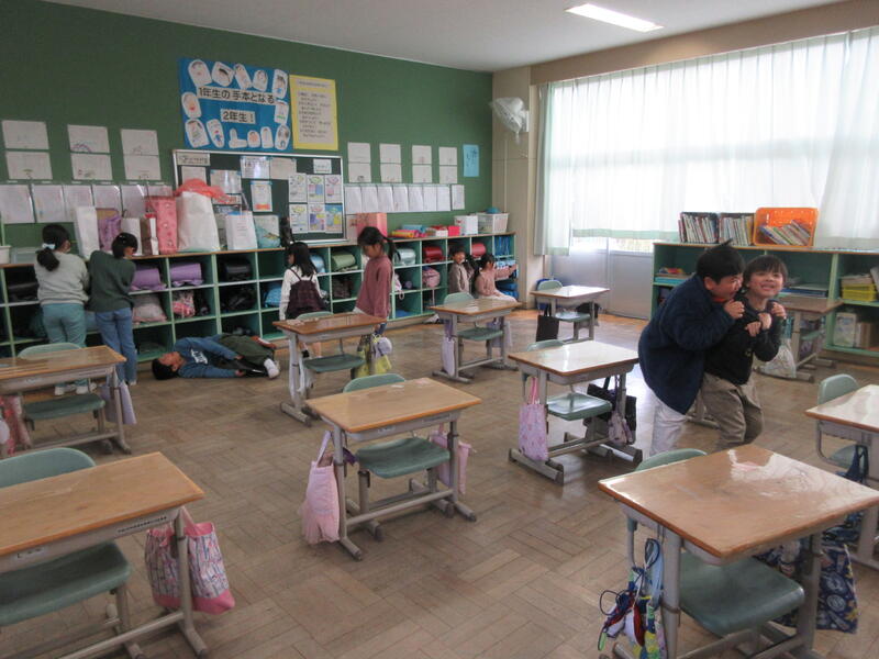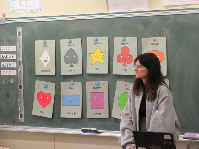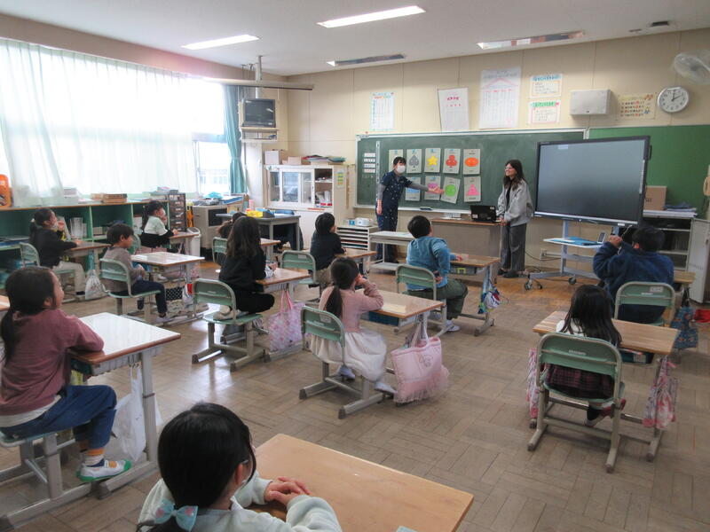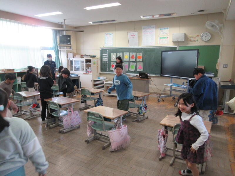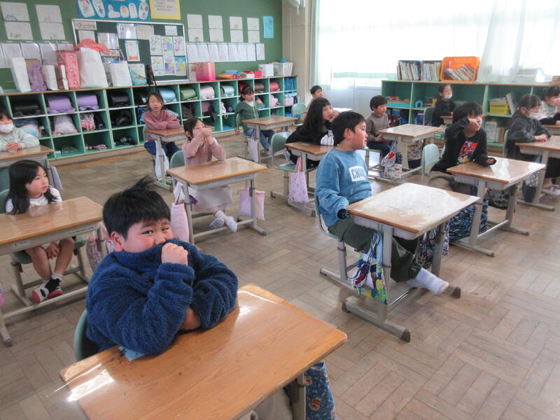 令和6年3月4日(月)、2年生は「外国語に親しむ活動」をしていました。来年度からの外国語活動への準備です。色について学習していました。white(白)、black(黒)、yellow(黄色)、brown(茶色)、…ALTの先生の発音をよく聞いて繰り返します。次に、ALTの先生の「Touch something black.(黒のものにさわって)」の指示を理解し、黒い色のものを探します。次々と、色の指示が変わっても、素早く対応します。十分に英語に親しんでいます。