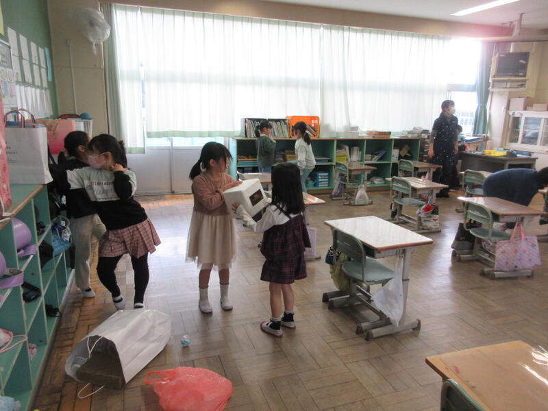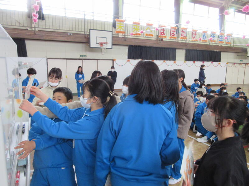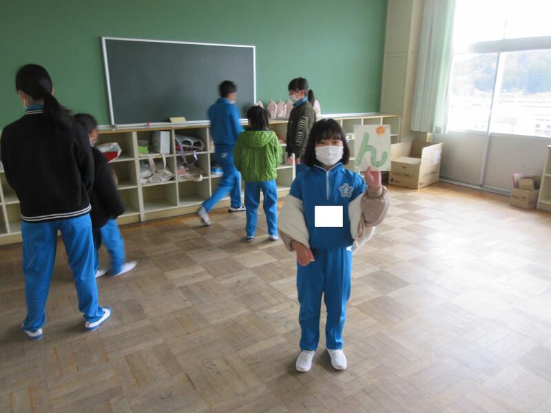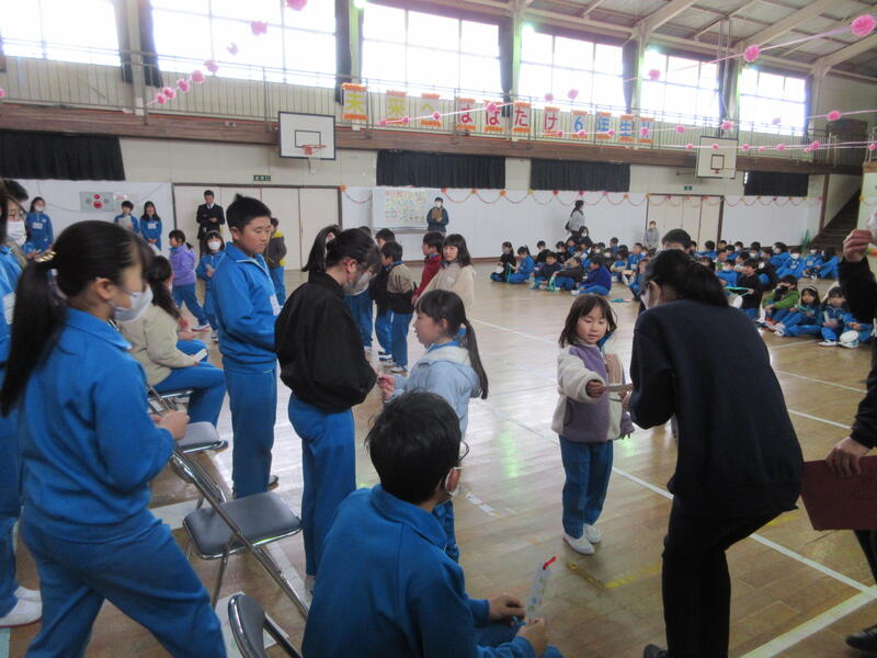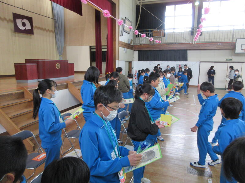 次に、5年生の代表が、たくさんのことを教わったと感謝の言葉を発表し、全校児童縦割り班で、校内宝探しを行いました。見つけたパズルのピースを合わせると、イラストともに「中学校でもがんばってください」のメッセージが完成しました。また、各学年ごとに感謝の気持ちをこめたプレゼントを贈りました。1年生からは、しおり。2年生からは、メダル。3年生からは、メッセージカード。4年生からは、似顔絵と花束。5年生からは、中学校に行っても頑張ってとダンスが披露されました。