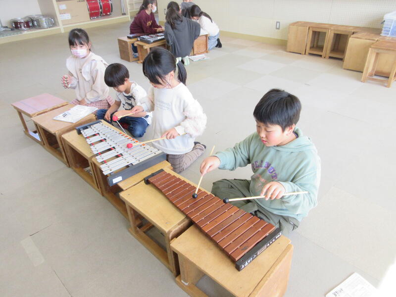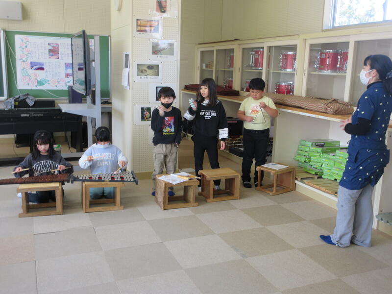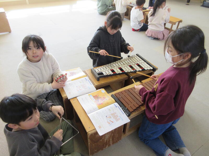 令和6年3月7日(木)、2年生は音楽「音楽時計の発表会をしよう」の授業です。木琴、鉄琴、鈴、トライアングルの担当で1つのグループをつくり、演奏します。聴いているととても心地よく、心が癒やされました。