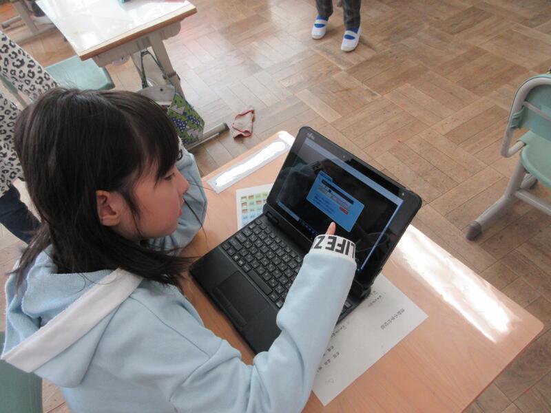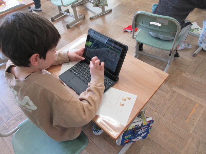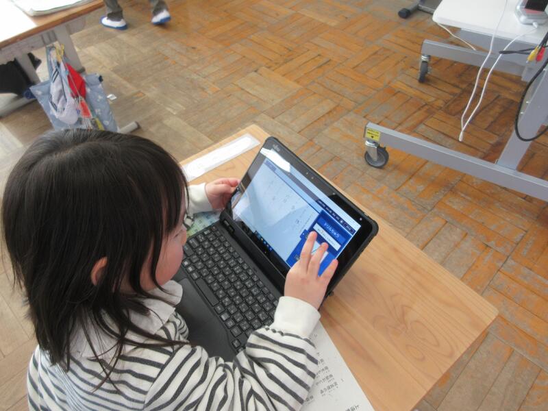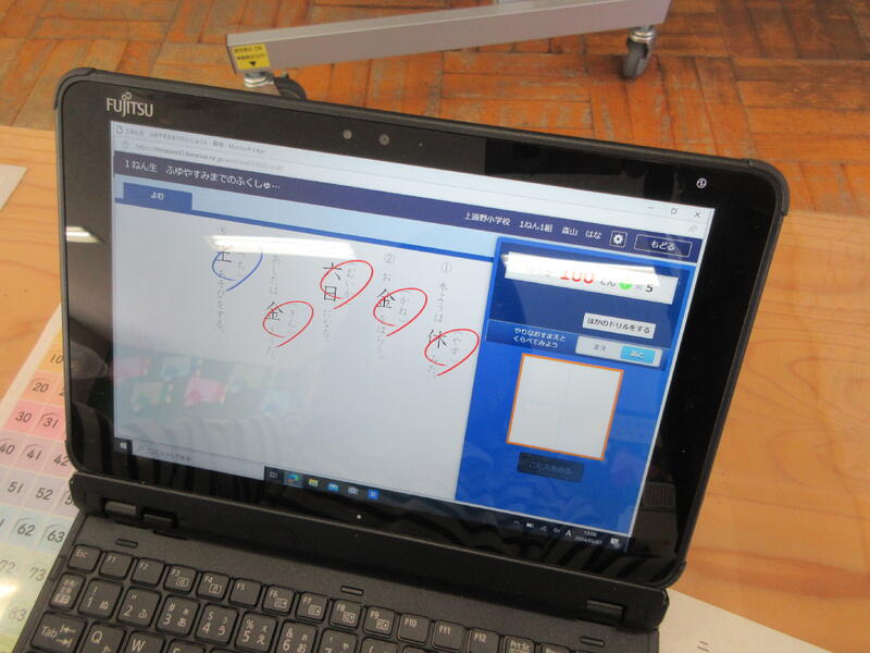 1年生は、これまで習ったお勉強の復習です。ドリルテキストだけでなく、タブレットを使い、自分のペースで学習を進めていました。タブレットを使って答えを入力すると、すぐに採点してもらえ、間違え(入力ミス)に再挑戦することができました。1年生でも、すらすら使いこなしています。