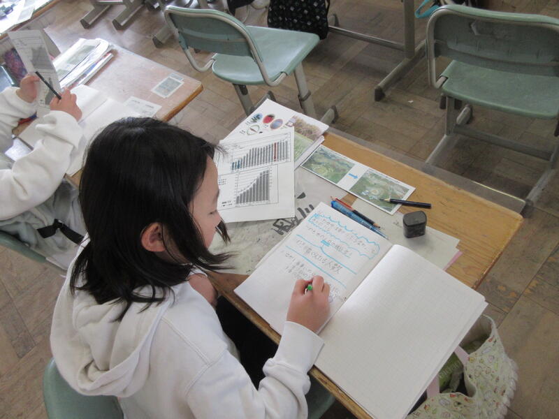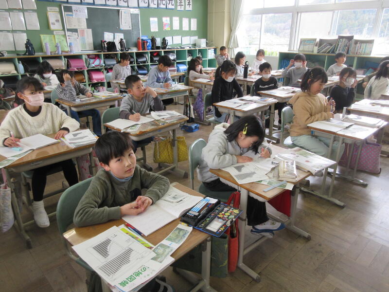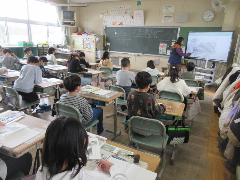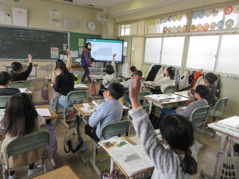 令和6年3月8日(金)、3年生は社会の授業です。いわき市の人口の移り変わりについて学習していました。人口が一番多いのは、少ないのは?さらに、一番増えているのは?グラフの長さを見たり、お隣のグラフと比較したりして考えます。ちなみに、一番人口が多いのは、1995年(平成7年)で36.1万人です。一番増えているのは、1945年(昭和20年)から1950年(昭和25年)で、5~6万人増えています。