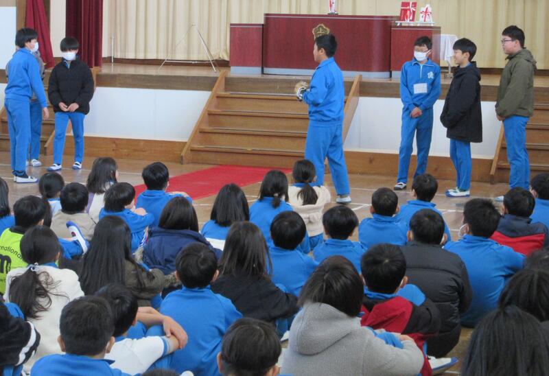 令和6年3月14日(木)、6年生から、在校生に感謝の気持ちを伝えるムービーを作成したので、見てもらいたいという申し出があり、臨時で全校集会を行いました。写真と共に、今年度の行事の振り返りがあり、6年生の代表児童から、「全校の皆さんと思い出を作ることができてうれしい。いままでありがとうございました。」と感謝の言葉が伝えられ、「最後のチャイム」の合唱がありました。