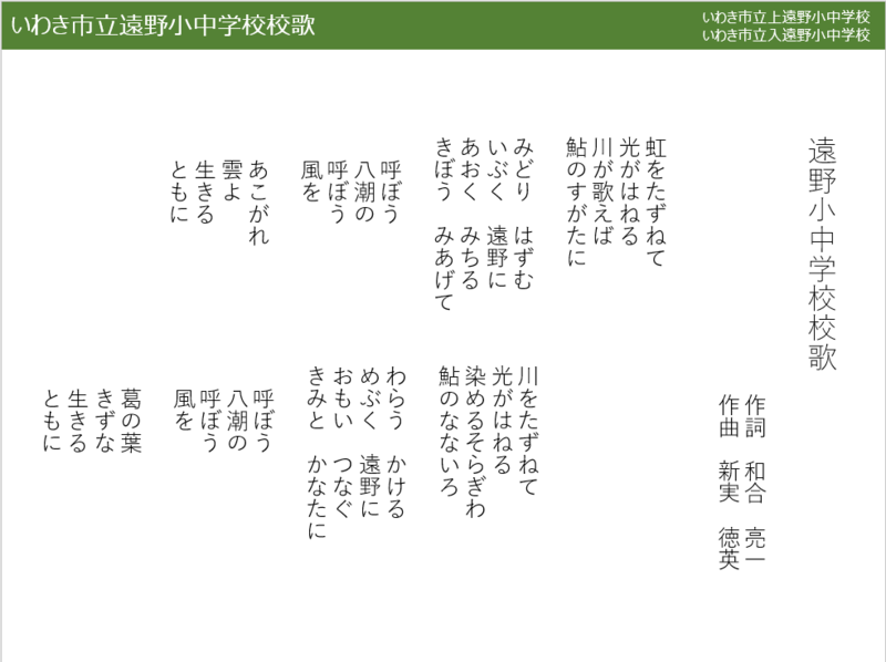 続いて、来年度の遠野小中学校校歌を全体練習しました。各学級ごとに朝の時間等を使って練習してきましたので、全校児童で合わせました。今後も、練習を続け、素晴らしい歌声にしていきます。