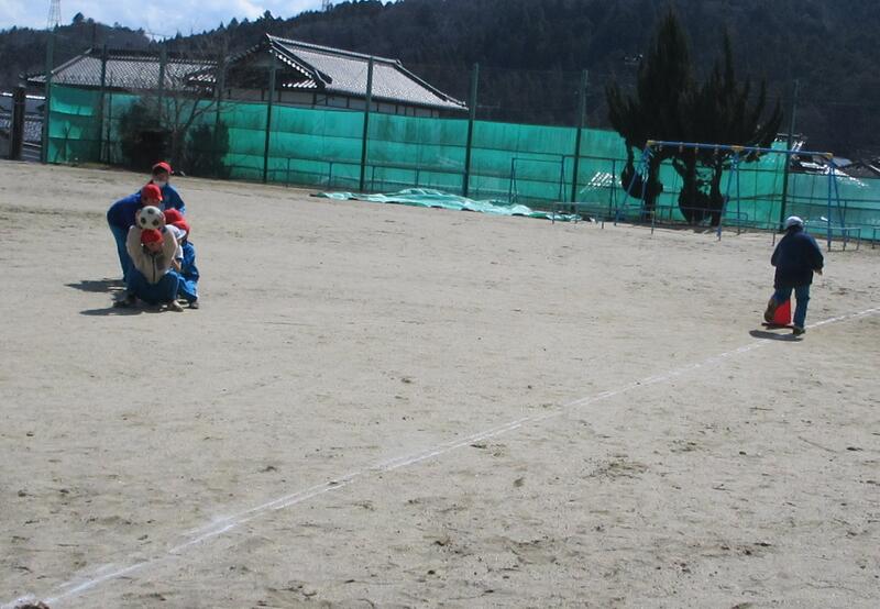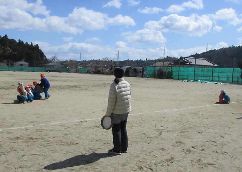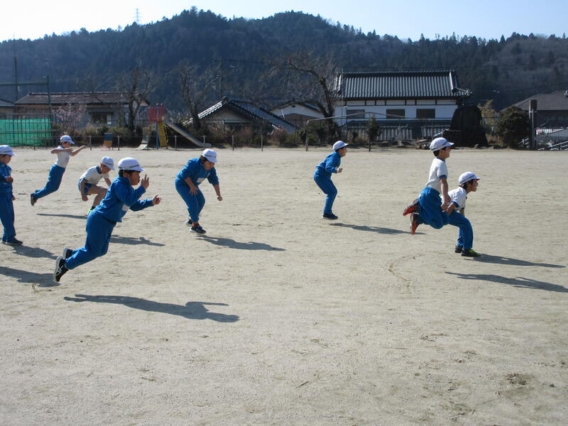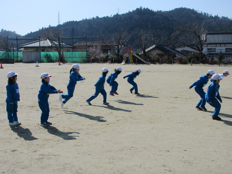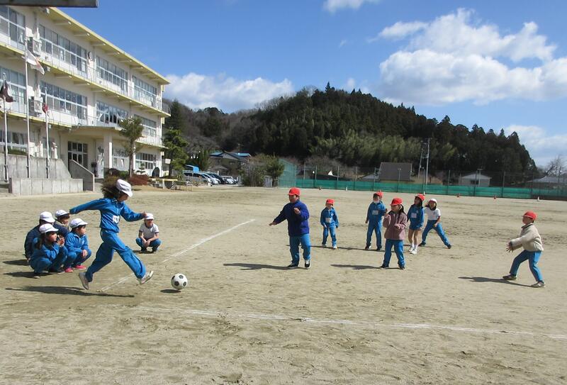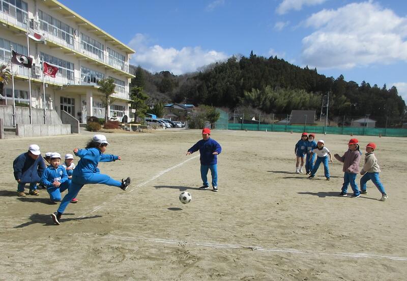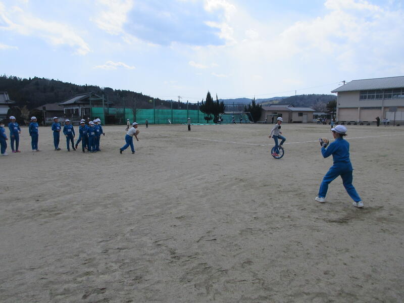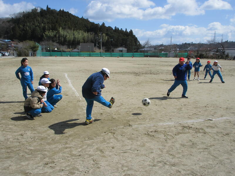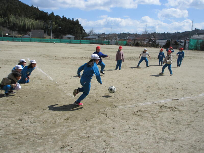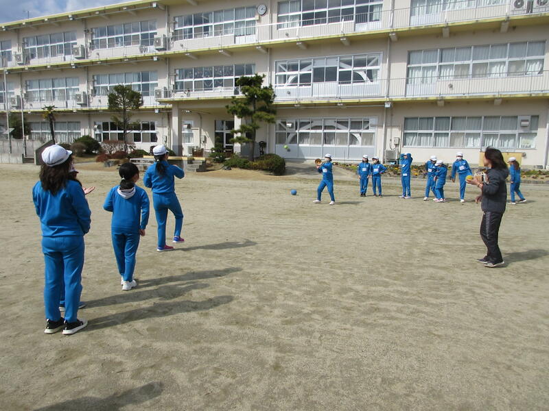 令和6年3月13日(水)、2年生は体育の授業です。ならびっこキックベースをしていました。ルールは、攻撃側がボールを蹴り、守備側の誰かがボールをとったら、その後ろに守備のメンバーが並びます。全員が並ぶ前に、蹴った人がベースまで行ければ得点です。風はまだ冷たいですが、元気一杯体を動かしています。