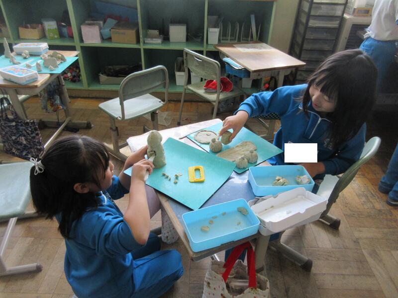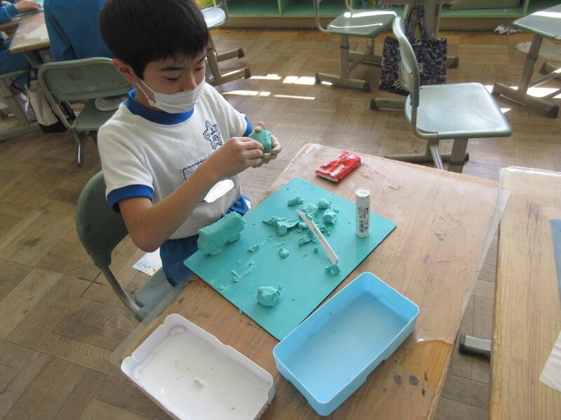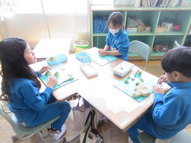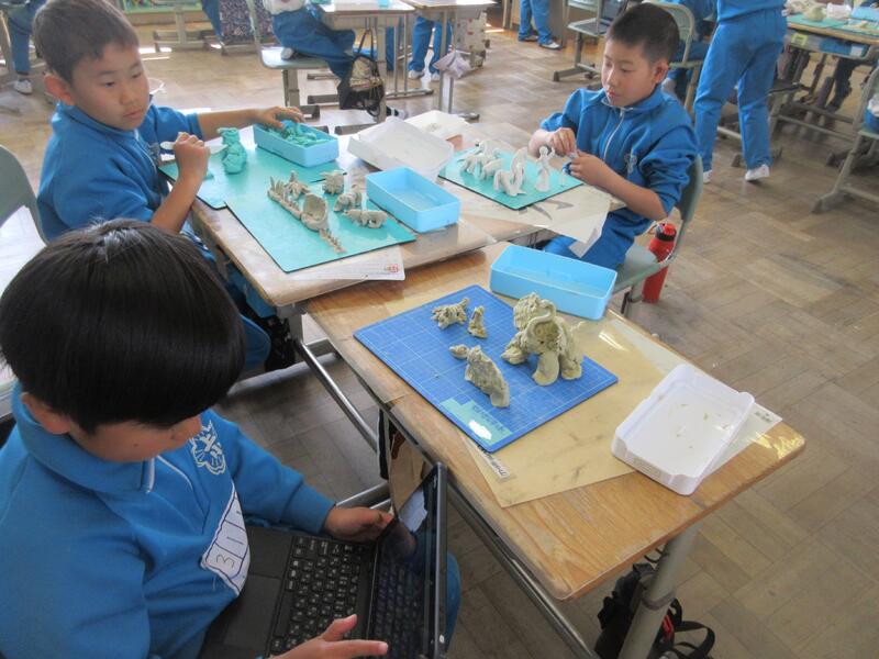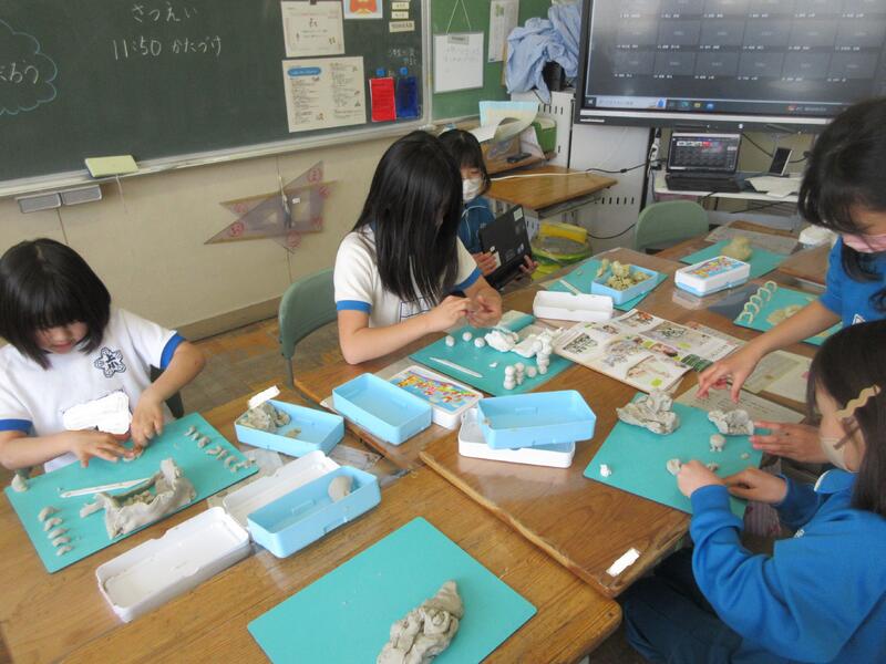 3年生は、図工の授業「粘土でマイタウン」です。どんな町に住みたいか考え、作っていました。人気の動物園、ワニのうろこ1つ1つまで再現しています。スカイツリーのようなタワー、お菓子の国、電車、… 子どもたちの夢あふれる楽しい町になりそうです。完成したら、タブレットで撮影、電子黒板で共有します。