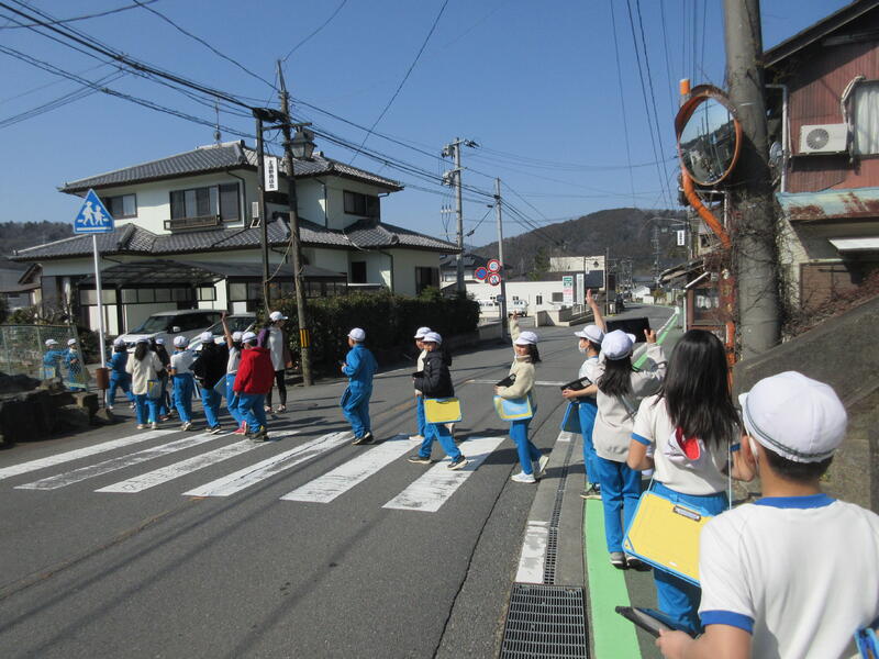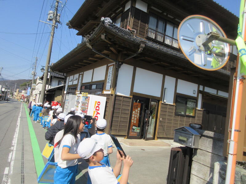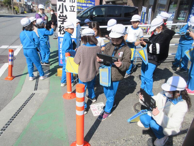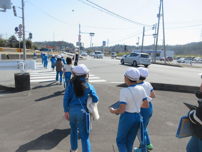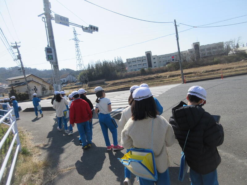 令和6年3月15日(金)、3年生は、社会科で校外学習です。上遠野町内を実際に歩き、交通事故から暮らしを守る設備を探しました。一人ひとりタブレットを使って、見つけた設備を写真に撮ります。横断歩道に、信号機、横断歩道やスクールゾーンの表示、カーブミラー、緑の歩道、ガードレール、縁石、…とたくさんあります。たくさんの設備が子どもたちを守ってくれているのが分かります。途中、会った町の方にもしっかりごあいさつ、横断歩道をみんなで渡りました。