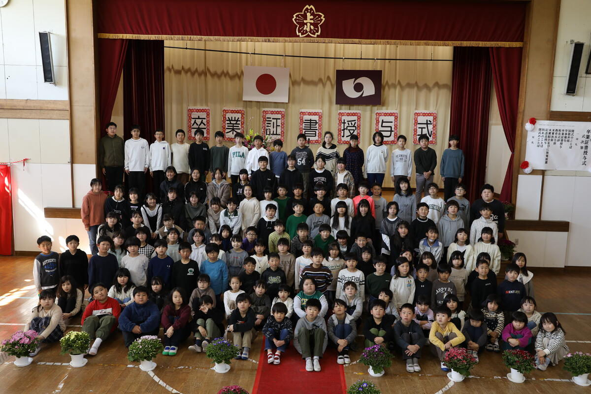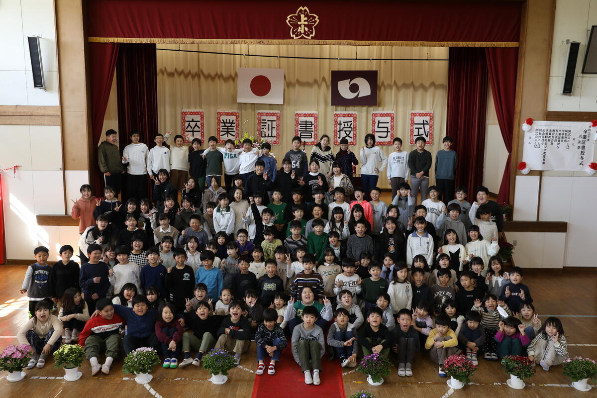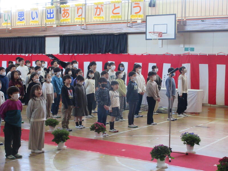 続いて、全校児童での最後となる校歌斉唱を行いました。上遠野小学校への感謝の心が感じられる素晴らしい歌声になりました。最後に、全校児童で記念撮影を行い、楽しかった学校での生活が感じられる笑顔の記念写真となりました。