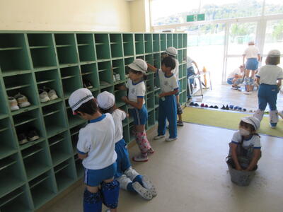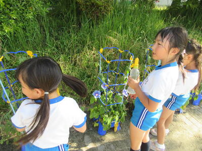 令和5年7月10日(月)、1年生がアサガオの水やりに来ると、多くの花が咲いていました。薄紫、赤紫、ブルー、ピンク、…子どもたちは、「きれい。」「この色いいな。」「グラデーションになっている。(難しい言葉を知っています)」「つぼみがある。」とうれしそうです。