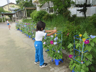令和5年7月14日(金)、1年生がアサガオへ水やりをしています。ブルー、紫、赤紫、…色とりどりの花に心いやされます。水色は涼しげで、ピンクは優しく穏やかな感じです。「あっ、クローバー」アサガオの葉の陰に発見したようです。