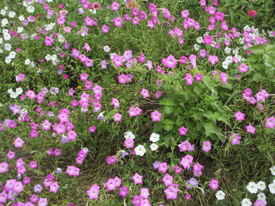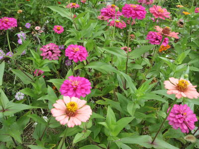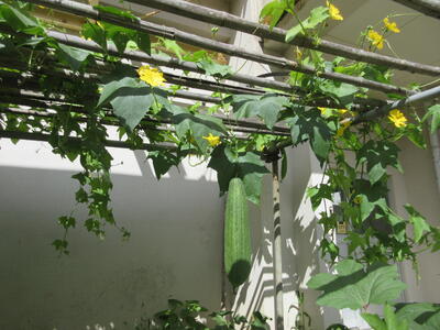 ペチュニア、百日草が満開です。へちまも大きく実っています。