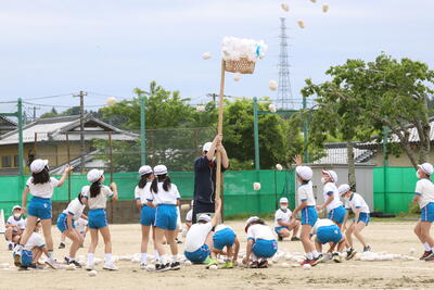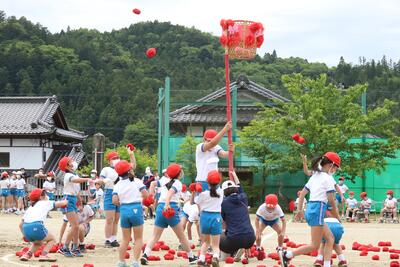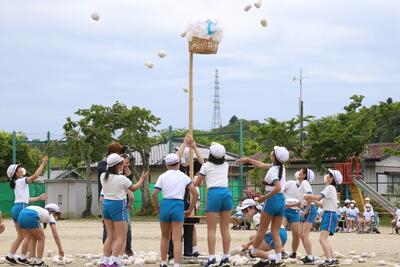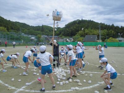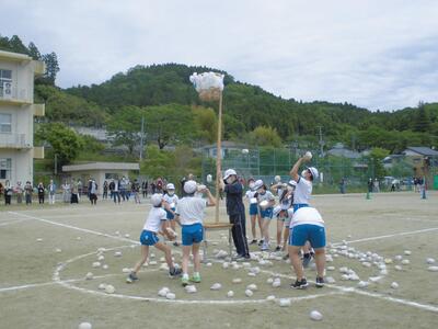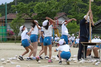 令和4年5月15日(日)、紅白玉入れ、中学年の部のかごの高さは、いすの上からとなります。かごの高さが少し高くなりましたが、そこは中学年、昨年の経験を生かして頑張りました。結果は、白の勝ち。