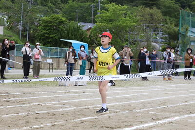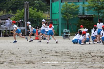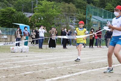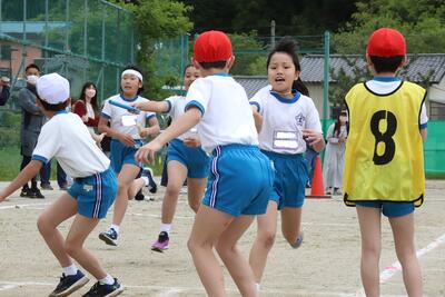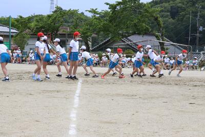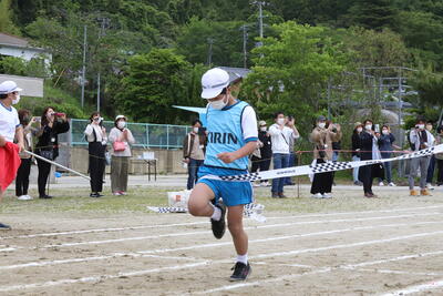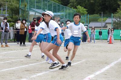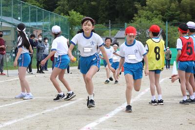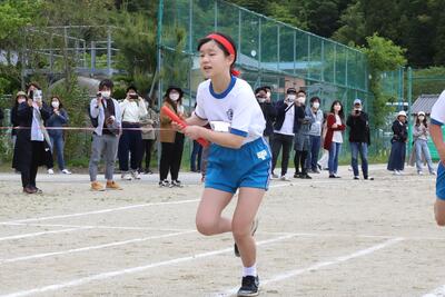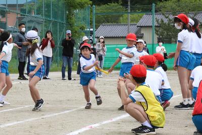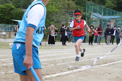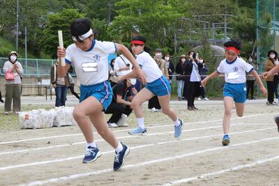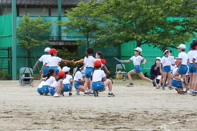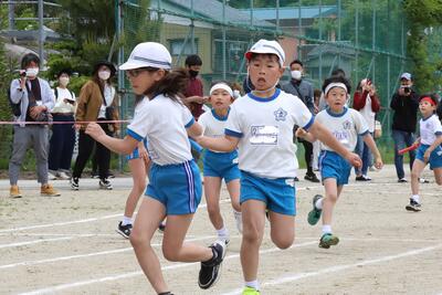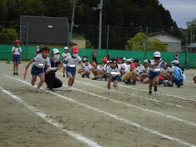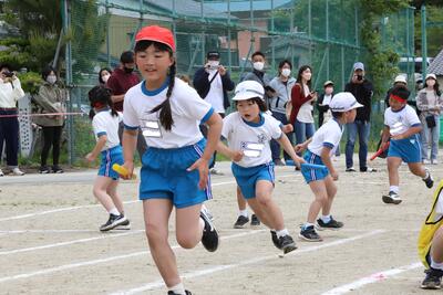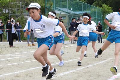 令和4年5月15日(日)、運動会のラストを飾るのは、紅白対抗リレーです。内側から、白帽子、白はちまき、紅帽子、紅はちまきの順に並び、スタートします。1年生から4年生までは、トラック半周、5・6年生は、1周します。低学年の一生懸命な走り、中学年、高学年と上がるにつれて、スピードが増し、迫力もでます。結果は、白紅紅白で、「紅白勝ち」となりました。全員が本気になって、全力を出しました。