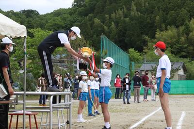 令和4年5月15日(日)、閉会式で、成績発表。白組161点、紅組160点で、白組の勝ちとなりました。優勝した白組には、優勝カップ、紅組には参加賞が授与されました。講評では、教頭より、「紅組、白組、どちらも頑張りました。どちらにも優勝を贈りたい。」と講評があり、紅白、両方の健闘が讃えられました。次に、校歌斉唱、国旗降納と続き、運動会が閉会となりました。