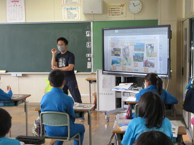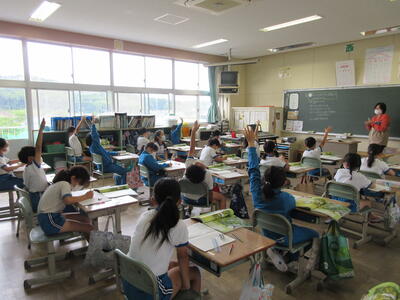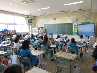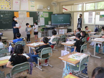 3年生は理科での授業でした。花畑とキャベツ畑にいるモンシロチョウの写真を見て、「モンシロチョウは何をしているか」を考えていました。手をあげて、色々な考えを発表していました。「花のみつをすっている。花ふんをとばしている。…赤ちゃんをうんでいる。たまごをうんでいる。…」