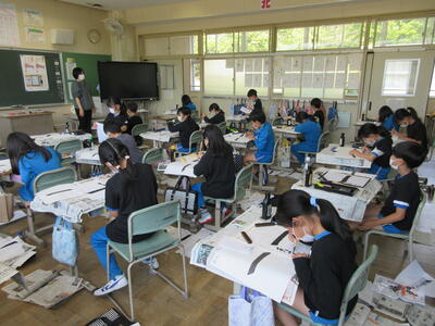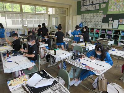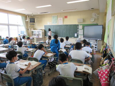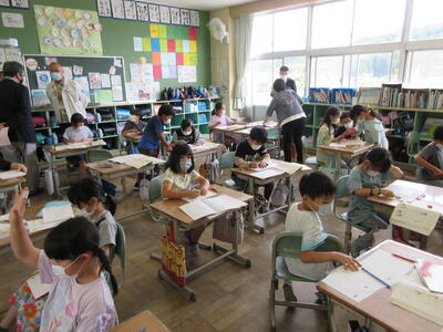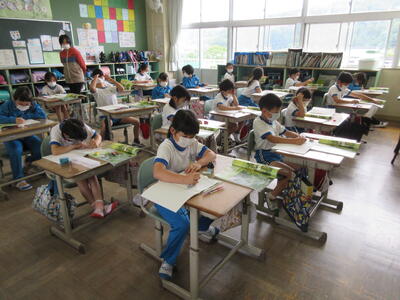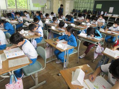 3年生は書写で「一」を清書していました。自分の名前もしっかり書きます。できた児童から、先生に提出していました。なかなかのできに満足げです。