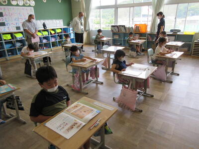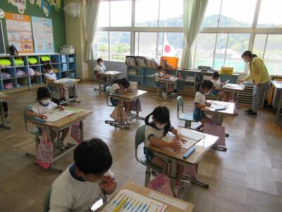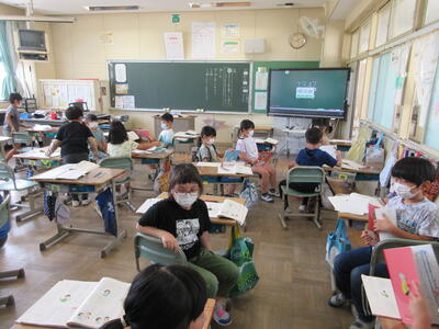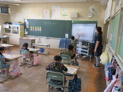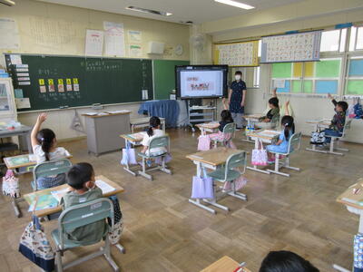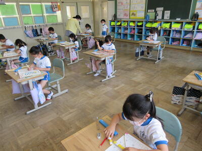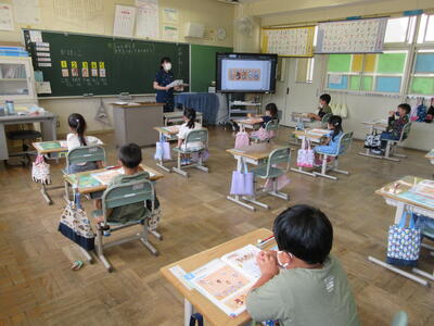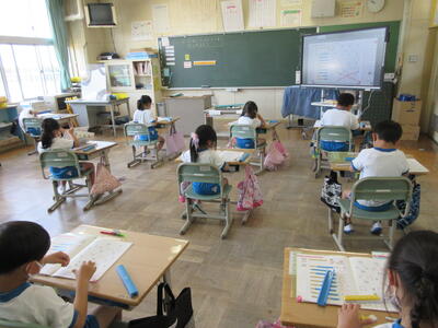 1年生は算数で、順番を数で表す授業でした。「ウサギさんは、何番目ですか。」「はい、3番目です。」きちんとした言葉で発表できます。授業を参観されて、いつも以上にやる気が出たようです。