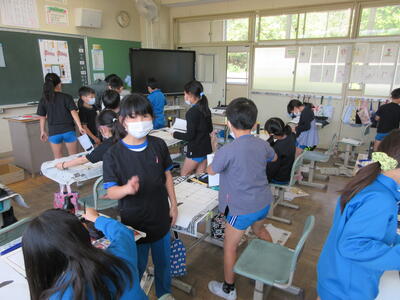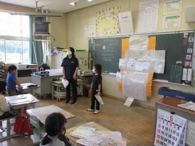 2年生は生活科で、まちたんけんの計画です。あめや、ローソン、コメリ、下山田精肉店、…。身近なお店について、説明していました。ちなみに、下山田精肉店のハムカツがおいしいそうです。