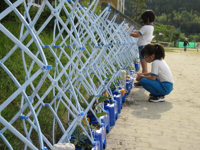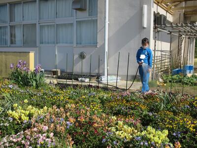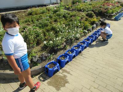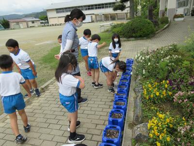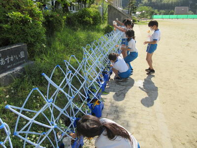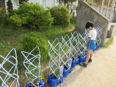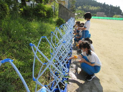 令和4年5月20日(金)、2年生が朝から、生活科で育てている野菜の苗に水やりをしています。毎日の日課になっています。一日一日、成長するのを確認しながら、楽しみに水やりをしています。