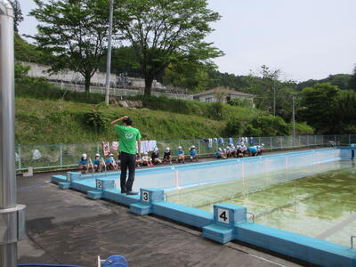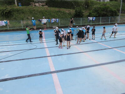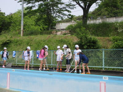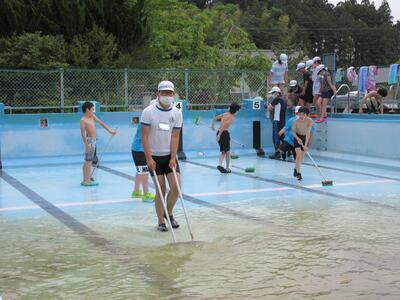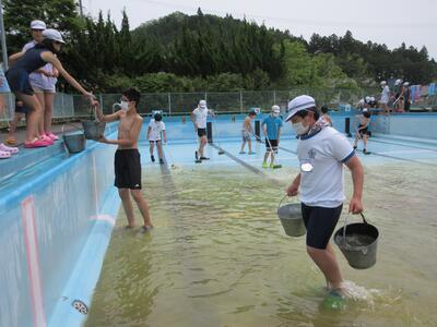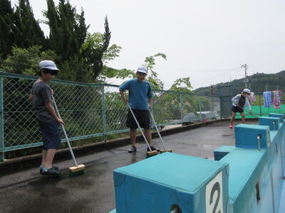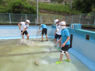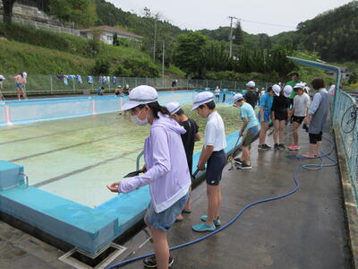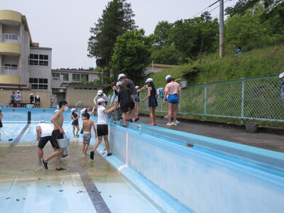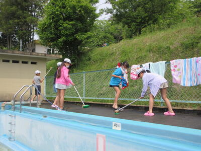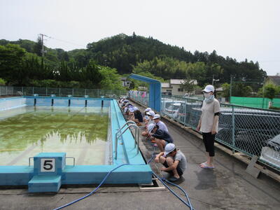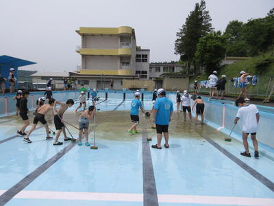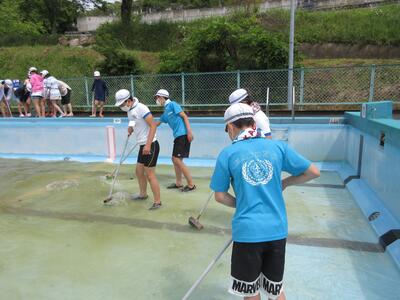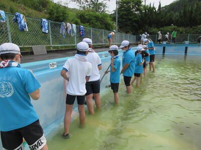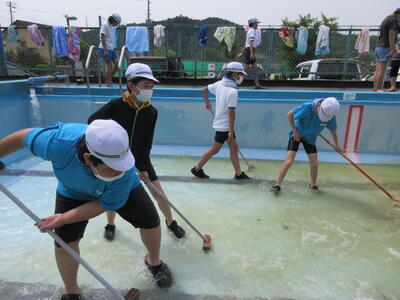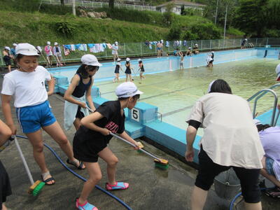 令和4年5月20日(金)、5・6年生でプール清掃を行いました。1年ぶりに見るプールは、緑色に濁っています。数日前から、水抜きをし、清掃しやすい水深にしました。デッキブラシを使い、5年生はプールサイド、6年生は、プールの壁面から始め、水を抜きながら、プールの底を磨いていきます。途中、水の排水が遅いので、バケツを使った連携プレーでどんどん水をくみ出し、清掃を進めていきました。夢中になって取り組んでくれたおかげで、予定の2時間で、見違えるほどきれいになり、完了することができました。きれいなプールで、水泳の授業ができます。5・6年生の力を実感したプール清掃でした。