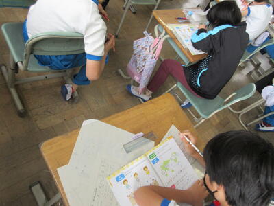 令和4年5月23日(月)の授業の様子です。4年生は外国語活動、ALTの先生との授業でした。「I'm in Japan. It's sunny. …」世界各地の天気を英語で聞き取り、教科書にその天気の絵を描いていました。慣れたもので、よく聞き取っていました。