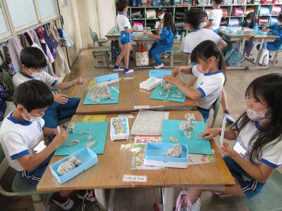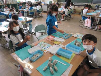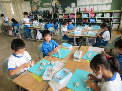 2年生は図工の授業でした。「にぎにぎねん土」で、にぎったときにできる形を利用しながら、作品を作っていました。きのこ、サイコロ、恐竜、カチューシャ、…。一人一人、作品が違っています。アイディア豊富ですね。