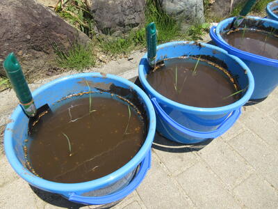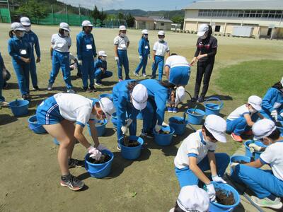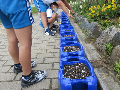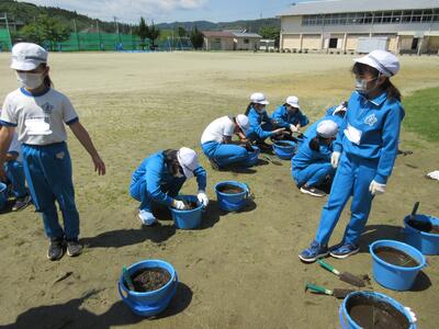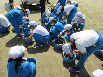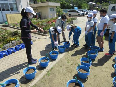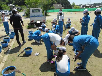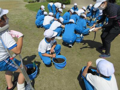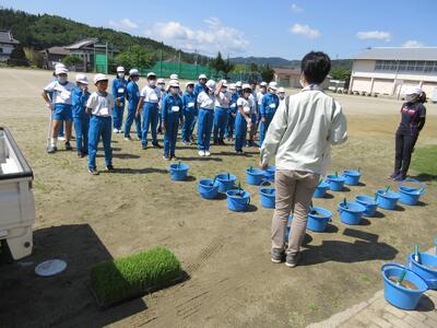 令和4年5月24日(火)、5年生がJA遠野支店の協力のもと、バケツ稲づくりに挑戦しました。社会科で米づくりについて学習しますので、一人一人が実際に稲を育てることにより、日本の稲作や農業について、具体的に考える機会になると思います。用意されたバケツの土に水を入れ、シャベルで混ぜ、一人3本の稲の苗を植えました。上手に育てると、1本の苗から、お茶碗1杯分のお米が収穫できるそうです。楽しみですね。ただし、夏の水やりが大切とのことでした。