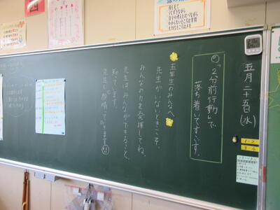 令和4年5月25日(水)、朝のメッセージです。担任の先生が出張のため、黒板に子どもたちへのメッセージが書かれてありました。「先生がいないときこそ、みんなの力を発揮してね。…」担任は、いつも、学級のこと、子どもたちのことが頭にあります。
