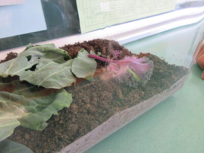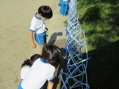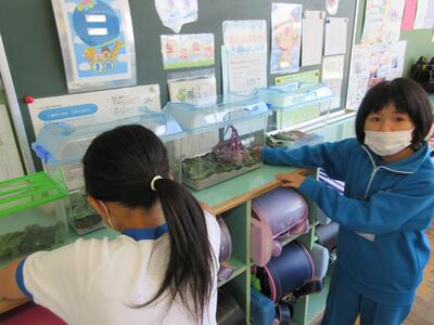 令和4年5月25日(水)、朝の様子です。3年生は、教室でアオムシの観察です。キャベツをもりもり食べて、成長しています。「脱皮したの。」「さなぎになっている。」「アオムシ動いている。…」夢中になって観察しています。モンシロチョウになるのが楽しみですね。