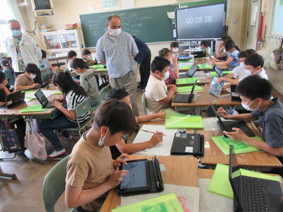 4年生は総合で、福祉について考えていました。タブレットを活用し、キーワードをまとめていきます。福祉→お年より→…。考えが広がっていきます。ブレットの使い方は、慣れたものです。参観者の方も驚いていました。