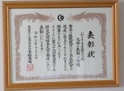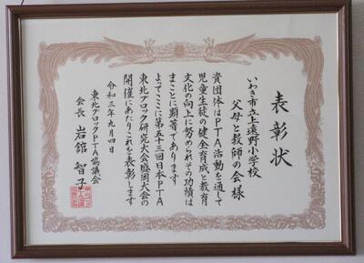本校の父母と教師の会(PTA)が、PTA活動を通して、児童の健全育成と教育文化の向上に努めた功績が認められ、昨年度、東北ブロックPTA協議会と県PTA連合会から表彰を受けました。本来であれば、今年度のPTA総会で、会員の皆様にご披露するところでしたが、総会が紙面での開催となりましたので、ホームページで紹介します。学校の教育活動は、全て児童の成長のためという原点を忘れず、保護者の皆様のご理解とご協力を得ながら、取り組んで参りますので、よろしくお願いします。