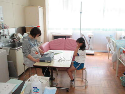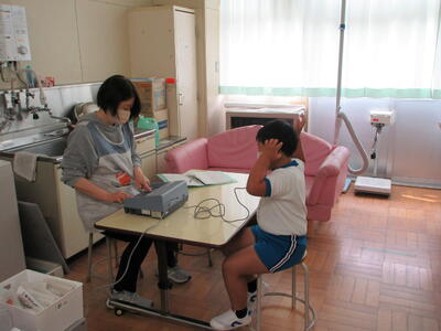 令和4年4月26日(火)、聴力検査の様子です。機械を使って、聴力を確認します。1・2・3・5年生で実施しました。「音が聞こえたら、手をあげてください」「無言で(はい)」連絡が必要な場合のみ、お知らせします。