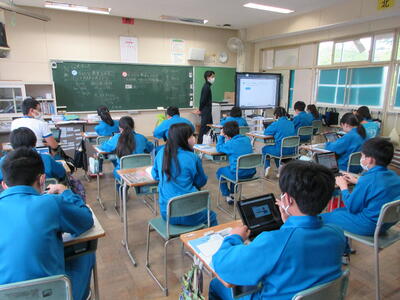 6年生は、算数の「文字と式」です。分からない数量を文字にして問題を考えます。この学習は中学1年生の1学期の「方程式」の学習の基礎となります。教科書の問題の解けた生徒は、タブレットを利用し、自分のペースでさらに練習を進めていました。