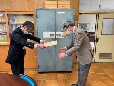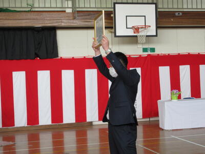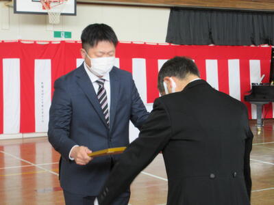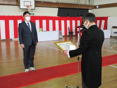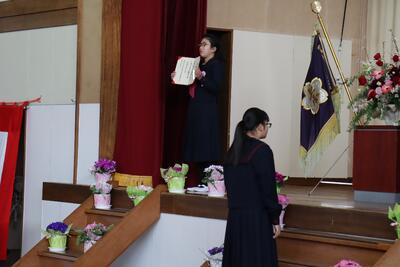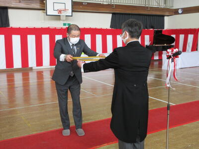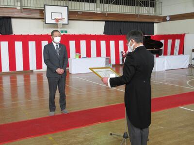 卒業式が行われる前に、PTA感謝状の贈呈式が行われました。長い間本校のPTA活動にご協力をいただき、かつ、今年度お子さんが卒業する方に贈られます。今年度は2名の保護者の方に贈られました。長い間、本校のためにご尽力いただき、ありがとうございました。感謝申し上げます。