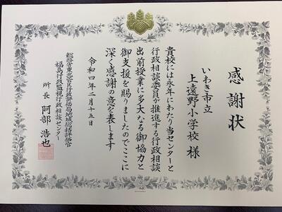 本日、行政相談委員による「行政相談出前授業」を12年間継続して行っていることによって総務省の管轄である福島行政監視行政相談センター様より感謝状をいただきました。
