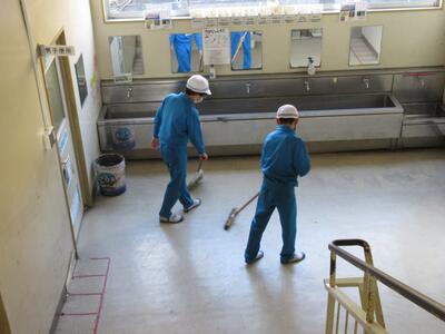 今日は6年生が学校内を清掃してくれました。家庭科の「掃除の仕方」の学習から、実践というかたちで掃き掃除や水道掃除を行いました。