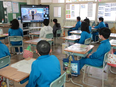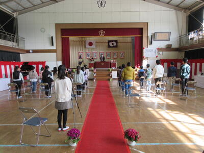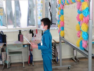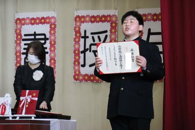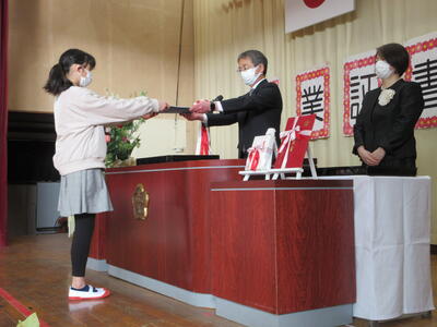 今日は、卒業証書授与式とともに修了証書授与式も行われました。新型コロナウイルス感染拡大防止の点から、5年生が代表として体育館で式に参加し、他の学年は各教室でリモートにて参加しました。堂々と証書を受け取る5年生の姿に、来年度、最高学年となる気持ちが表れているようでした。その後、校長先生から一年間の頑張りと成長についてお話をいただきました。