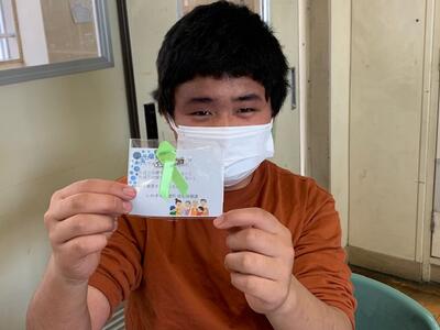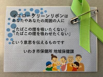 いわき市保健所地域保健課から6年生に「イエローグリーンリボン」が届きました。その意味は「たばこの煙を吸いたくない」という意思を示すものです。