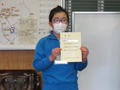 今回は県の書き初め展と校内書き初め展の表彰がありました。県の書き初め展では、1年生が奨励賞をいただきました。校長先生から紹介があり、堂々と賞状と盾を受け取ることができました。