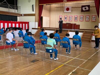 「ふくしまを十七字で奏でよう 絆ふれあい支援事業」に全校課題として取り組んだところ、出品率がとても高かったことと、一字審査通過作品が多かったこと(絆部門9点・ふるさと部門1点)が評価されて「学校賞」をいただきました。