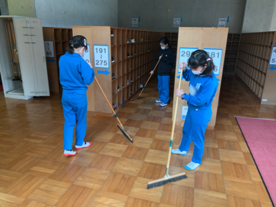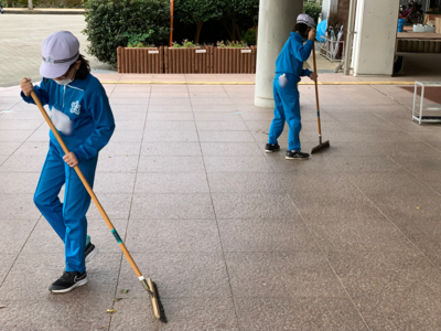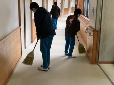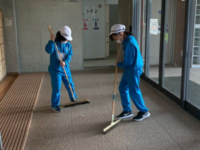 朝食までの間、館内清掃の時間です。分担して頑張りました。テーマは「来たときよりも美しく!」です。