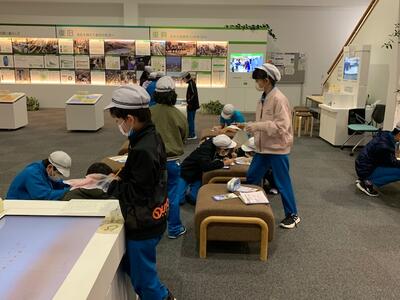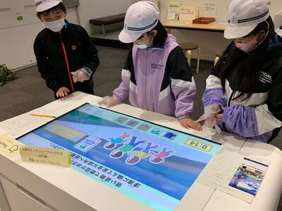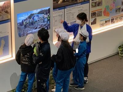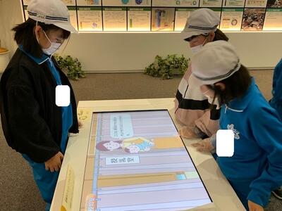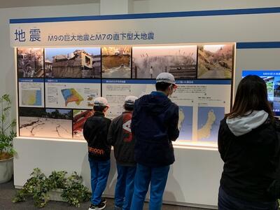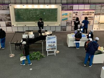 あれから10年が経過していますが、当時の写真や映像、豊間中学校の「奇跡のピアノ」、3年生教室の希望にあふれたメッセージでいっぱいの黒板(3.11の午前中は卒業式でした)などが展示してあります。また、タッチすることで参加できる防災ゲーム等もあり、子どもたちは楽しみながらも防災の大切さについて考えていました。