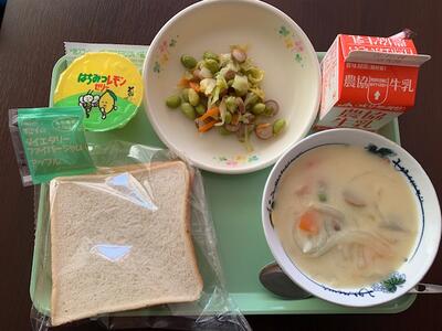今日の給食のメニューは、食パン・りんごジャム・牛乳・枝豆とウインナーのソテー・コーンクリームスープ・はちみつレモンゼリーです。実はこのメニューは本校ゆかりのものでした!