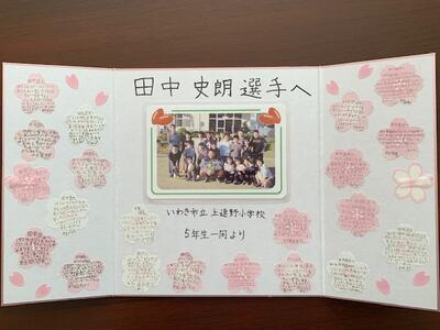 写真ではわかりづらいですが、一人一人のカードには、それぞれの「アピール」が記されています。田中選手の胸にみんなの「アピール」が届くといいですね!