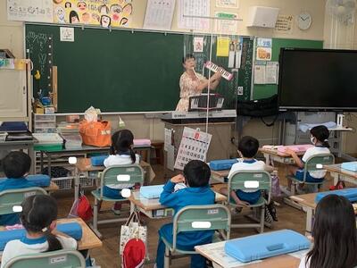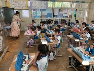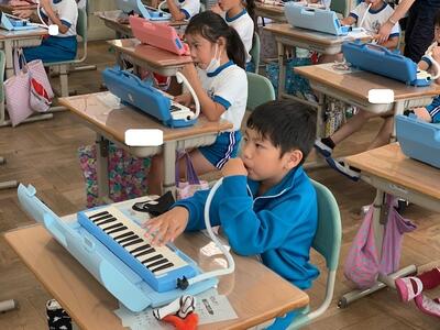 それから、指の番号(1から5まで)や鍵盤の押さえ方や滑らかな演奏の仕方等について実際に音を出しながら体験していました。「今日、初めて鍵盤ハーモニカにさわった」という子どもたちもいましたが、みんな、講師の先生のお話を聞き、約束を守り、楽しく学習できました!