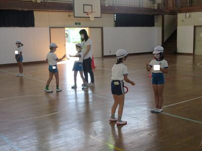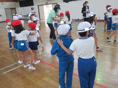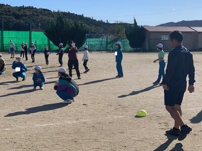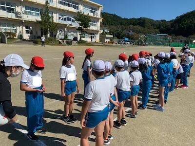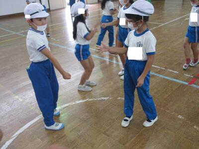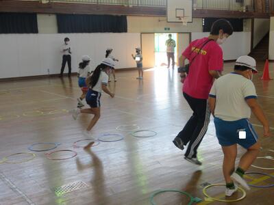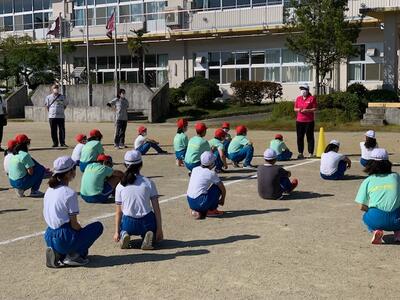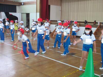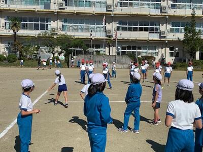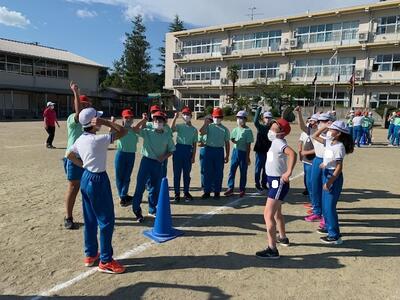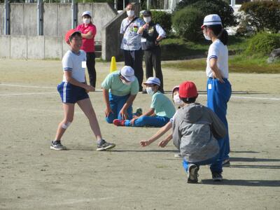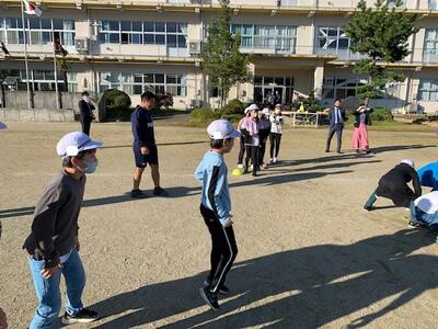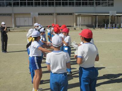 まず、1年生は「貨物列車」「リレー遊び」「ドッジビー」の3種目で交流しました。夏休み前の交流会と比較すると、両校の垣根が低くなったような印象を受けました。いい傾向ですね!