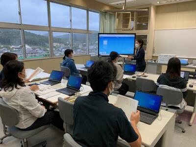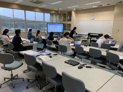 授業の動画をそれぞれ視聴した後、本校では、本日講師をお招きしてギガ端末の使い方の研修会を行いました。一人一人(児童)が端末で作成したメモを教員が瞬時に回収して添削して返却する機能や一人のノートにみんなで考えたことを書き込む機能など、即授業で使えるようなプログラムを学びました。早速授業で使ってみたいと思います!