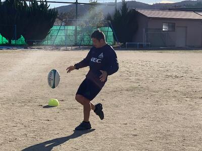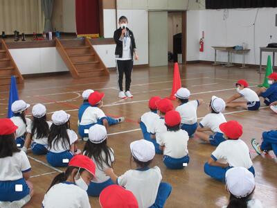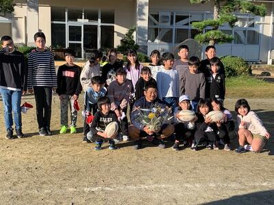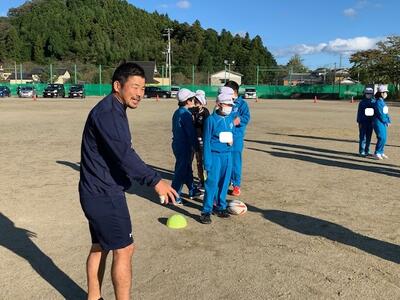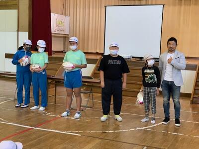 準備運動のあと、トライゲーム、パスゲーム、ボール横取りゲーム、そしてハイボールキャッチなどを教えていただきました。はじめの頃はなかなか声を出せない児童もいましたが、後半の横取りゲームの頃は「早く!早く!」「あのチームに負けるな!」ととても元気な声を出して盛り上がっていました!ゲームで優勝したチームの一人には日本代表のユニフォーム(!)、それから各クラスにもラグビーボールを一つずついただきました。